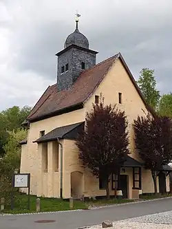 Die kleine hohe Saalkirche war die im 14. Jahrhundert errichtete Kapelle des ehemaligen Rittergutes. Sie wurde 1618 zur heutigen Kirche mit einem eingezogenen Chor umgebaut. Anstelle der ursprünglich vorhandenen kleinen Apsis wurde 1844 östlich ein polygonaler Abschluss angefügt. Der schiefergedeckte Dachreiter und die Patronatsloge haben eigene Außenzugänge. Im Dachreiter hängen zwei Glocken aus Bronze, die kleinere 1934, die größere 1952 datiert. Der dritte Platz ist leer. Das Kirchenschiff ist mit einem Satteldach bedeckt. Der Innenraum ist mit einer hölzernen Kassettendecke überspannt, die 1939 von einem Neustädter Maler eine Blumenbemalung erhalten hat. Zwei zweigeschossige Emporen umlaufen den Raum. Ihre Brüstungen sind ebenfalls bemalt. Der Kanzelaltar von 1844 dient als Trennwand zum Chor. In Wandnischen befinden sich vier hölzerne, farbig gefasste gotische Skulpturen eines ehemaligen Altarretabels von ca. 1500. Es sind von links der heilige Wolfgang, ein Marienbildnis, die heilige Barbara und die heilige Anna Selbdritt. Der Kanzelkorb zeigt keine Figuren, nur im Schalldeckel ist die Heiliggeisttaube. Die Figur des Petrus ist heute der Schaft des Ambos. Über dem Altar hängt eine Kreuzabnahme, die der Gemeinde 1861 geschenkt wurde. Es ist eine Kopie nach einem Bild in der alten Pinakothek. Die Orgel mit sieben Registern, verteilt auf ein Manual und das Pedal, wurde 1782 von Christian August Gerhard unter Verwendung alten Materials gebaut und 2005 von Gerd-Christian Bochmann restauriert.[2]