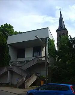 1959 wurde die Kirche wegen Baufälligkeit geschlossen. Der Hang, an dem die Kirche errichtet wurde, war abgesackt und beschädigte die Bausubstanz schwer, sodass die Kirche einsturzgefährdet war. Die mittlerweile eigenständige Pfarrei entschloss sich zum Abriss und Neubau der Kirche, der zunächst an der Finanzierung scheiterte. Die 1966 als Provisorium geweihte und erst 1977 vollständige Kirche wurde als einfacher Betonbau ausgeführt, der im Gegensatz zur ersten Kirche bis zum Hangrand vorgesetzt wurde. Der erhalten gebliebene Kirchturm konnte stabilisiert werden und ist seitdem deutlich nach hinten versetzt in den Neubau integriert. Der Innenraum wird durch das gewaltige überlebensgroße Kruzifix an der Südwand und die schlichten, rechteckigen Fensterreihen an der Westwand bestimmt. Der Nordseite ist eine verzweigte Treppe vorgelagert, über die der Höhenunterschied der Hanglage überwunden wird.