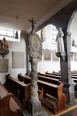 Der Bildstock im Eingangsbereich der Kirche, der bis 1959 auf dem Burkardrother Friedhof gestanden hatte, stammt aus dem Jahr 1684. Die Hochreliefs an seinen drei Seiten zeigen eine Ölbergszene, die Dornenkrönung und die hl. Veronika mit dem Schweißtuch. Ebenfalls im Eingangsbereich der Kirche befindet sich eine Pietà, die im Jahr 1888 von Wohltätern gestiftet wurde.