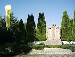 Im südwestlichen Teil des Friedhofes befindet sich das Ehrenmal für die 22 gefallenen Söhne des Ortes im Ersten Weltkrieg und die 47 gefallenen Soldaten im Zweiten Weltkrieg. Es wurde in den 1950er Jahren fertig gestellt. Den Mittelpunkt der Gedenkstätte bildet eine schlichte ca. 2,5 m hohe aus hellgrauem Stein gehauene Jesusfigur. Christus, der Erlöser, breitet seine Arme aus. Sein Blick ist nach unten gewandt. Auf seinem herabhängenden Gewand und auf dem Denkmalsockel sind die Namen der gefallenen Soldaten, sortiert nach ihren Todesjahren, eingraviert. Die Gedenkstätte mahnt zum Frieden in der Welt.