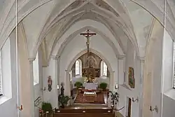 Dabei wurde im Chorraum der Kirche ein Freskenzyklus aus der Bauzeit teilweise erhalten und wieder freigelegt, dazu ein großes Christopherusbild aus dem beginnenden 16. Jahrhundert. Im Gewölbe des Langhauses konnten Rokokofresken aus dem Jahr 1758 freigelegt werden, die zuvor übermalt worden waren.[1]