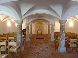 Noch aus dem romanischen Vorgängerbau stammt die Krypta der Stiftskirche, die dem heiligen Sebastian geweiht ist. Die Krypta ist eine dreischiffige Halle und besteht aus fünf Jochen. Romanische Säulen aus Nagelfluh tragen das Kreuzgratgewölbe. Ursprünglich diente die Krypta in der Zeit von 1479 bis 1804 als Bestattungsort für den Ortsadel sowie die Chorherren des Kollegiatstiftes. Im Jahr 1884 wurde die Krypta erweitert und konnte von dieser Zeit an direkt vom Kirchenschiff aus betreten werden. Seit der Renovierung der Stiftskirche in den 1960er Jahren wird die Krypta auch für Gottesdienste verwendet. Die vergoldete Taube, ein Sinnbild des Heiligen Geistes, die über dem Altartisch in der Apsis schwebt, wurde von Peter Sulzer aus Augsburg im Jahr 1995 geschaffen. Rechts und links der Apsis befinden sich auf Konsolen frühbarocke Figuren. Dargestellt sind der heilige Sebastian und die Muttergottes.[19]