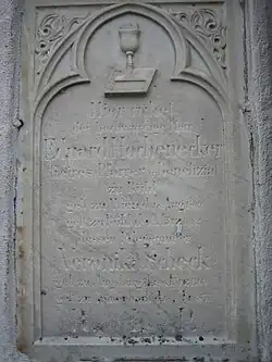 Im Jahre des Herrn 1482 am 8. Mai starb der edle Herr Ludwig von Rothenstein und Leonstein, Ritter, Stifter dieses würdigen Stifts. Im Jahre des Herrn 1501 am 15. April starb die edle Frau Jutta von Hürnheim, seine Hausfrau. Denen Gott gnädig sei. | |