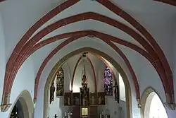 Im Innenraum befinden sich ein barocker Nebenaltar und ein neugotischer Hochaltar. Der Volksaltar wurde am 25. Juli 1981 konsekriert. Die Buntglasfenster des Chores sind Werke von Felix Kreusch, die er um 1950 geschaffen hat.[3]