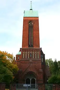 Im Zweiten Weltkrieg wurde der ursprünglich 86 m (oder 96 m?[5]) hohe Turm der Kirche beschädigt. Bei den Luftangriffen war er ausgebrannt. Statt einer Reparatur wurde die Gemeinde genötigt, den Turm auf 61 m abtragen zu lassen. So wurde erreicht, dass der Turm der Kirche nicht in das Straßenbild der „sozialistischen Stalinallee“ kam. Insbesondere sollte der Kirchenbau nicht die Deutsche Sporthalle überragen. Der DDR-Architekt Hermann Henselmann wählte dazu 1961 aus drei vom Kirchenvorstand vorgelegten Turm-Entwürfen die heute sichtbare Variante aus, einen quersitzenden Sattel mit Dachreiter. Der neue Turm ist nur noch 66 Meter hoch.