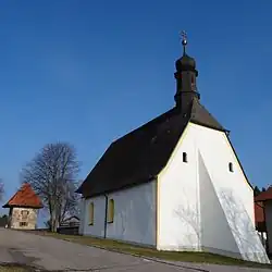 Die gotische Saalkirche wurde 1616 verändert. Sie besteht aus einem Langhaus, das im Westen von einem Pfeiler gestützt wird, und einem eingezogenen, dreiseitig geschlossenen Chor im Osten. Das Langhaus ist mit einem Krüppelwalm bedeckt, auf dem im 18. Jahrhundert ein sechseckiger, schiefergedeckter Dachreiter im Westen aufgesetzt wurde, der den Glockenstuhl beherbergt und der mit einer Zwiebelhaube bedeckt ist. Im mit einer Flachdecke überspannten Innenraum sind das Langhaus und der Chor durch einen Chorbogen getrennt. Zur Kirchenausstattung gehört ein Hochaltar, auf dessen Mensa die Statuen des heiligen Quirin, des heiligen Dionysius und des heiligen Wolfgang stehen.