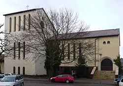 Im Anschluss an das bereits 1935 entstandene Klostergebäude der Augustiner entwarf Felix Hinssen den ersten vollständig neu konzipierten katholischen Kirchenbau nach dem Zweiten Weltkrieg. Der zweigeschossige Baukörper hat den Grundriss des lateinischen Kreuzes. Die einschiffige Hallenkirche hat ein Querschiff. Der Mauerwerksbau ist über einem roten Ziegelsockel sandfarben verputzt. Der Kirchsaal liegt im Obergeschoss, zu dem eine Freitreppe an der Längs- und Straßenseite hinaufführt. Das Erdgeschoss nimmt den Gemeindesaal und die Werktagskapelle auf. Die Wände sind durch schlanke eng gereihte Bogenfenster gegliedert. Das Langhaus und der Chor sind mit Satteldächern bedeckt. Über dem östlichen Arm des Querschiffs liegt der Glockenturm, der ebenfalls ein Satteldach trägt, dessen Dachfirst parallel zu dem des Langhauses liegt. Der westliche Arm des Querschiffs befindet sich unter dem Schleppdach des Turms. In der Glockenstube hängt ein Geläut aus drei Bronzeglocken: