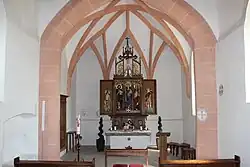 Im Innenraum wurden teilweise gotische Fresken aus dem Anfang des 15. Jahrhunderts freigelegt, die der "Meraner Schule" zuzuordnen sind. Sie zeigen die Geburt Christi und die Anbetung der Heiligen drei Könige. Der Chor besitzt ein Kreuzrippengewölbe. Der Altar ist ein Flügelschrein aus dem 19. Jahrhundert mit den Skulpturen einer Madonna flankiert von Johannes dem Täufer und dem Kirchenpatron St. Ruprecht im Mittelteil aus dem Ende des 15. Jahrhunderts.[4] Die Pietà auf der Predella stammt aus dem 16. Jahrhundert.[5] Die Orgel aus 2011 wurde von Oswald Kaufmann gefertigt.[6]