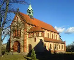 Der Außenbau ist durch Zierbögen und Pilaster aus Backstein gegliedert, dazwischen befinden sich verputzte Wandflächen. Statt eines Turmes, dessen Standort an der Nordwestecke der Kirche ausgespart blieb, besitzt die Kirche einen kupferverkleideten Dachreiter mit zwei kleinen Glocken. An der Westfassade befindet sich ein tief gestuftes Rundbogenportal. Über den drei großen Westfenstern ist ein gusseiserner Schriftzug im Halbbogen angebracht, der lautet: „Christus vincit - Christus regnat - Christus imperat“ (Christus siegt – Christus regiert – Christus herrscht). Es ist der Liturgie des Christkönigsfestes entnommen.
