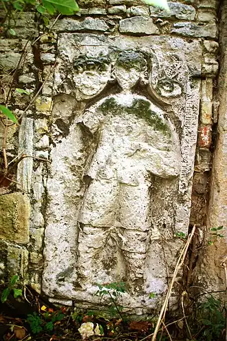 In der Außenfassade des Turms ist neben der Eingangstür im zugemauerten Rundbogen ein Bildgrabstein eingearbeitet worden. Dieser soll einer Legende nach an den Amtsschreiber David Philipp Günter aus Athensleben erinnern, der im Jahr 1658 vom Pfarrer Tilmann Comander aus Borne mit einem Messer in der Schulter verwundet wurde, als Günter in Bisdorf Steuern eintreiben wollte. Drei Tage später erlag er seinen Verletzungen und wurde in Bisdorf beigesetzt.[21] Der Stein ist stark verwittert, aber man kann Teile der Inschrift, wie das Wort „SCHREIBER“ sowie eine Figur mit Schriftrolle in der Hand gut erkennen.
