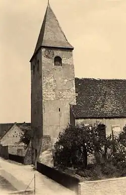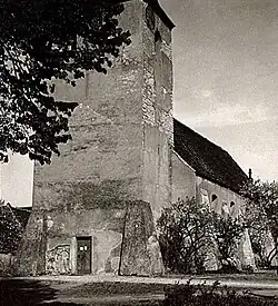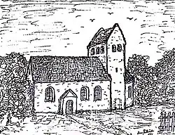 Das ursprüngliche, möglicherweise wie der Turm aus romanischer Zeit stammende, Kirchenschiff befand sich auf der Westseite des Turms. Über dessen bautechnische Beschaffenheit ist kaum etwas überliefert. Vermutet wird, dass es damals eine Apsis östlich vom Turm gab,[8] was nahelegt, dass der Turm selbst damals den Chor enthielt, eine für die Romanik typische Bauform.