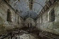Von innen wurde das große Tonnengewölbe wie auch das Kircheninnere insgesamt 1740 weiß gestrichen, mit gelben Leisten an den Chorpriechen.[33] Durch die große Fensterfront auf der Südseite muss die innen weitgehend weiße Kirche eine sehr helle, lichtdurchflutete Atmosphäre ausgestrahlt haben.[34] Bereits 1826 war eine Absteifung des Chores nötig, die jedoch heute nicht mehr erhalten ist und damit eines der vielen baustatischen Probleme darstellt.