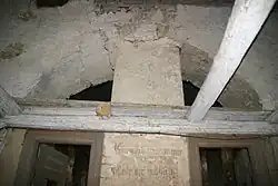 Der Bogen in der Ostwand dient seither als Durchgang in das Kirchenschiff und verfügt über einen mittig angeordneten Stützpfeiler. Auf diesem ist folgende Inschrift angebracht: