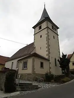 Der Kirchturm mit spitzem Helm steht als Chorturm im Osten. Der Chorraum im Untergeschoss besitzt ein Kreuzrippengewölbe. Das flachgedeckte Langhaus weist drei Fensterachsen auf. Ein runder Chorbogen trennt es vom Chorraum.