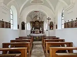 Der mittelgroße Kapellenbau hat ein zweijochiges Langhaus und einen kurzen leicht eingezogenen Chor mit Dreiachtelschluss. Gewölbt ist das Langhaus mit einer Stichkappentonne, die mit sparsamem Stuck verziert ist. Der Altarraum besitzt ein Stichkappengewölbe, das mit neobarockem Stuck aus Blattrippen mit Engelsköpfen bestückt ist.