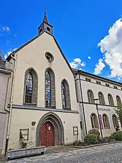 Die gotische Saalkirche wurde 1356 erbaut. Sie wurde 1585 und 1612 verändert. Aus dem Satteldach des Langhauses erhebt sich an der giebelständigen Fassade in geschlossener Bebauung ein quadratischer, schiefergedeckter, mit einem achtseitigen Knickhelm bedeckter Dachreiter, der hinter den Klangarkaden den Glockenstuhl beherbergt. Der Altar wurde 1760 errichtet. Eine hölzerne Statue des heiligen Sebastian wurde um 1700 geschnitzt.