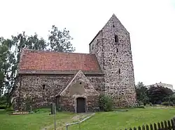 Westlich der Hauptstraße und südlich des alten als Rundling angelegten Ortskerns steht die Dorfkirche auf dem Friedhof.