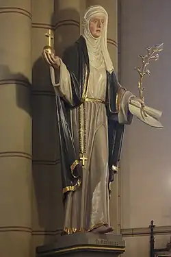 An den Säulen des Mittelschiffs sind sechs 1,85 Meter große Statuen angebracht, die jeweils Bezüge zum Kirchengebäude haben. Im vorderen Teil zwischen Altarraum und Kanzel befinden sich eine Herz-Jesu- und eine Mutter-Gottes-Statue. Die vier weiteren Statuen zeigen zwei für die heutige Zeit bedeutend angesehene Frauen, Katharina von Siena und Therese von Lisieux, sowie den Ordensstifter Dominikus und Albertus Magnus als weiteren bekannten Dominikaner.