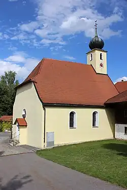 Die Saalkirche wurde um 1660 auf trapezförmigem Grundriss unter Einbeziehung von Teilen eines Vorgängerbaus errichtet. Sie besteht aus dem Langhaus, dessen Innenraum mit einer Flachdecke überspannt ist, während die den Turmunterbau seitlich flankierenden Räume Stichkappengewölbe besitzen. Über dem Giebel im Südosten erhebt sich der quadratische, mit einer Zwiebelhaube bedeckte Kirchturm. An der Nordwestseite ist in einem Vorbau der Eingang zum Kirchenschiff. Ein weiterer Vorbau als Zugang zum Chor und zur Sakristei befindet sich an der gegenüberliegenden Seite unterhalb des Turms.