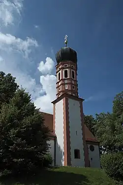 Der spätgotische Saalbau mit Flachdecke besitzt noch den polygonalen Chor der ehemaligen Chorturmanlage. Der Turm wurde 1694 aufgestockt.