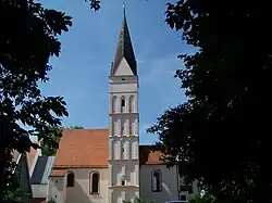 Die spätromanische Saalkirche wurde Ende des 13. Jahrhunderts als Wehrkirche errichtet und 1712 barock umgestaltet. Sie besteht aus dem um 1450 gebauten Langhaus zu drei Jochen, dem eingezogenen Chor im Osten und einer Sakristei an der Ostwand des Chors. Der Kirchturm an der Südwand des Langhauses hat fünf mit Blenden verzierte Geschosse und ist mit einem spitzen Helm bedeckt.