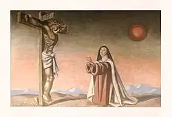 An der Frontwand des Seitenschiffs befindet sich ein weiteres Fresko von Richard Seewald, das die kniende Heilige Theresia im Gebet vor dem Gekreuzigten zeigt.[25] Aus der Zeit nach der Einweihung der Kirche stammt eine Gruppe von Holzfiguren, die der Holzbildhauer Beat Gasser (1892–1967), Lungern geschnitzt hat. Es handelt sich um eine Maria mit Kind, die sich in der Theresienkapelle befindet, um eine Pietà, die in der Mitte des Seitenschiffs steht, sowie eine aus elf Figuren bestehende Krippe, die in der Weihnachtszeit hier Verwendung findet.[26]