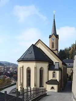 Der stattliche neugotische Sandsteinquaderbau steht am Hang des Schlossberges, östlich über dem Ortskern. Das Gotteshaus besteht aus einem eingezogenen, polygonalen Chor mit Fünfachtelschluss. Den Altarraum belichten vier spitzbogige Fenster mit zweibahnigem Maßwerk und überspannt eine hölzerne Flachdecke. Im nördlichen Winkel zum Langhaus befindet sich die Sakristei. Das Langhaus hat fünf Fensterachsen und ist mit dem Chor durch einen spitzbogigen Chorbogen verbunden. Es wird von einer hölzernen Flachdecke überspannt und hat ein verschiefertes Satteldach. In der westlichen Giebelwand steht der Fassadenturm.[3]