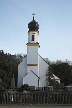 Die Kirche ist ein verputzter, mit einem Satteldach gedeckter Saalbau. An der Westseite des Langhauses erhebt sich der durch Gesimse gegliederte Glockenturm, der leicht aus der Fassade hervorsteht. Der Turm stammt wie der Chor noch aus spätgotischer Zeit. Der oktogonale Aufbau ist auf allen vier Seiten von rundbogigen Klangarkaden durchbrochen und wird von einer Zwiebelhaube bekrönt. An den Turm schließt sich ein mit einem Satteldach gedecktes Vorzeichen an, im südlichen Chorwinkel ist die Sakristei angebaut, die ein Pultdach besitzt. Der nicht eingezogene Chor weist spitz zulaufende Eckvorlagen auf.