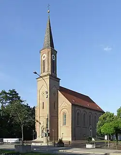 Die Kirche wurde nach Plänen von Lorenz Hoffmann durch Max Treu errichtet. Um eine möglichst hohe Spendensumme für den Bau zu sammeln, stellte man sie als nationales Denkmal zur Erinnerung an die Schlacht auf dem Lechfeld von 955 dar. Die Grundsteinlegung erfolgte daher am 9. August 1855 während einer großen Gedenkfeier zum 900. Jahrestag des Sieges über die Ungarn. Nach mehrjähriger Bauzeit wurde die Kirche am 10. August 1858 geweiht.[2]