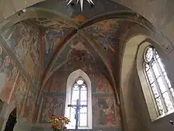 Im Innenraum des kreuzrippengewölbten Chors, also im Erdgeschoss des Chorturms, befinden sich Wandmalereien, auf denen u. a. das Jüngste Gericht dargestellt ist. Auf der Empore im Westen steht seit 1970 eine von Richard Rensch gebaute Orgel,[1] die ursprünglich für die Kilianskirche in Heilbronn gebaut wurde.