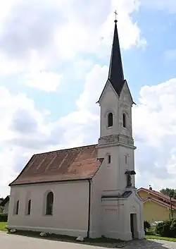 Der spätgotische Saalbau mit Westturm wurde 1686 umgestaltet. Der Turm stammt aus dem Jahr 1880.