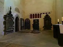In der Kirche befindet sich unter anderem das Grabmal des 1558 verstorbenen Amtsschössers Valtin Fuchs.
