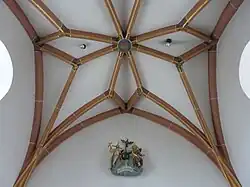 Die Deckengemälde wurden 1956/1957 von dem Maler Josef Braun aus Wangen im Allgäu geschaffen. Über der Orgelempore zeigt das erste Bild die Geburt Christi in einem zerfallenen Tempel. Diese Darstellung erinnert daran, dass mit Jesu Geburt eine neue Zeitepoche begonnen hat. Im zweiten Deckengemälde ist die Kreuzigung Jesu dargestellt. Unter den Trauernden – farbig hervorgehoben – sind seine Mutter Maria und der Lieblingsjünger Johannes sowie Maria Magdalena. Dargestellt wird auch der römische Hauptmann, von dem überliefert wird, er habe als erster den gekreuzigten Jesus als Sohn Gottes bekannt. Das dritte Deckengemälde stellt die Herabkunft des Heiligen Geistes auf Maria und die Jünger dar, das Pfingstfest. Zeichen für den Heiligen Geist sind die Taube und die züngelnden Flammen (Feuerzungen).