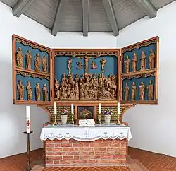 - Wichtigstes Stück der Ausstattung ist der dreiflügelige geschnitzte Altar aus der Zeit um 1480 im spätgotischen Stil. Die ursprüngliche mittelalterliche Fassung ging im Laufe der Zeit verloren. Die Kreuzigungsszene ist in realistischer Art ausgeführt. Die Kreuzigung und der Streit um den Rock Christi sind figurenreich und anschaulich dargestellt. Die beiden Seitenflügel zeigen Bischöfe, Heilige und Apostel. Ein ursprünglich in der Predella aufgestelltes Relief der Anna selbdritt, mit Anna und Maria mit dem Jesukind und den jeweiligen Ehemännern Joachim und Josef dahinter, wurde 1686 durch ein barockes Gemälde des Abendmahls ersetzt. Rechts und links davon stehen die Einsetzungsworte, wie sie bei der Abendmahlsfeier gesprochen werden.[3]