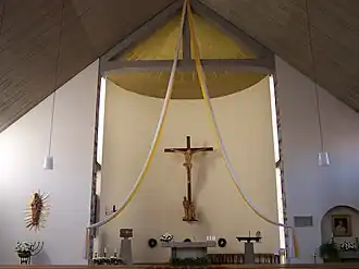 Bei der Pfarrkirche St. Vinzenz von Paul handelt es sich um einen längsrechteckigen Bau mit hohem Satteldach, der außen wie innen zeltartig wirkt. Im Westen schließt sich an den Gemeinderaum eine halbrunde Apsis an, welche den um drei Stufen erhöhten Altarbereich enthält. Gegenüber auf der Ostseite befindet sich das Hauptportal, darüber die Orgelempore. Der Kirchenraum wird auf der Ostseite durch trapezförmige Sprossenfenster beleuchtet, die in einer der Dachneigung folgenden Stufung angeordnet sind. Auf der Nord- und Südseite bezieht der Raum sein Licht durch in Dreiergruppen angeordnete, wiederum trapezförmige Sprossenfenster. Außerdem sind am Übergang vom Gemeinderaum zur Apsis längliche Verglasungen angeordnet, welche die gesamte Höhe der Apsis einnehmen. Durch diese erfolgt eine seitliche Beleuchtung des Chorraumes.[1]
