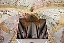 Zu sehen sind im Chorgewölbe Szenen aus dem Marienleben und zwar die Verkündigung, die Geburt Jesu, die Anbetung durch die drei Könige, Mariä Himmelfahrt und die Krönung Mariens. Außerdem sind die „drei heiligen Madel“: Margaretha, Katharina und Barbara, sowie Johannes der Täufer mit Lamm und Buch zu sehen. Im nächsten Gewölbe ist das Weltgericht nebst kaum noch erkennbaren Hölle und Himmel sowie der Seelenwäger St. Michael abgebildet. Neben Gott als Weltenrichter knien fürbittend Maria und Johannes der Täufer. Es sind ferner Simon von Cyrene beim Kreuztragen, weitere Personen am Kreuzweg sowie die Kreuzigung mit Maria und Johannes dem Evangelisten unter dem Kreuz sowie die Kreuzabnahme bzw. die Pieta abgebildet. Auf dem Gewölbe oberhalb der Orgel sind Szenen aus dem Leben des Kirchenpatrons St. Vitus mehr oder weniger gut sichtbar. Das Liebespaar im Baum eines Minnegartens ist vermutlich ein Hinweis auf die Versuchung des hl. Vitus durch Lustbarkeiten. Auf einem weiteren Bild wird er ausgepeitscht und auf einem anderen versucht man ihn vor einem Götzenbild, das auf einer Säule steht, zu erschlagen. Es zeigt eventuell das Martyrium im Ölkessel.