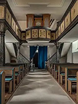 Die unteren Geschosse des viergeschossigen Chorturms sind spätromanisch. An ihn wurde 1713 das Langhaus mit zwei Jochen angebaut. Zu dieser Zeit wurde der Chorturm um ein Geschoss aufgestockt, das hinter den rundbogigen Klangarkaden den Glockenstuhl beherbergt, und er erhielt seine schiefergedeckte Welsche Haube, die mit einer Spitze bekrönt ist. Außerdem wurde an seiner Nordseite die Sakristei angebaut. Zur Kirchenausstattung gehören der Altar, dessen Gebälk auf zwei Säulen ruht, und die Kanzel aus der Bauzeit des Langhauses. Die Orgel mit acht Registern, verteilt auf zwei Manuale und einem Pedal, wurde 1997 von Hey Orgelbau errichtet.[2]