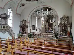 Der mit Rocaillen verzierte Innenraum des Langhauses ist mit einem Stichkappengewölbe überspannt. Zur Kirchenausstattung gehören ein Hochaltar, eine Kanzel und zwei Votivbilder.