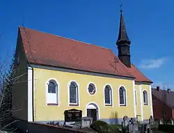 Die Saalkirche wurde im 17./18. Jahrhundert erbaut. Sie besteht aus einem Langhaus, das mit einem Satteldach bedeckt ist, und einem eingezogenen, dreiseitig geschlossenen Chor im Osten, auf dem ein achteckiger, mit Schindeln verkleideter Dachreiter sitzt, der den Glockenstuhl beherbergt und der mit einem spitzen Helm bedeckt ist. Der Innenraum beider Baukörper ist mit Kreuzgratgewölben überspannt. Zur Kirchenausstattung gehört eine um 1400 entstandene Pietà, die früher als Höhenberger Pietà bezeichnet wurde, ferner ein spätgotisches Marienbildnis und zwei hölzerne Reliefs mit der Heiligen Katharina und der Heiligen Barbara. Andere Stücke der Kirchenausstattung wurden an die 1971 eingeweihte neue Pfarrkirche übergeben.