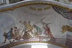 Die Ausmalung ist ein Werk des Franz Joseph Soll, das nach dem Chronogramm auf der Kartusche am Chorbogen 1775 geschaffen wurde. Das kreisrunde Kuppelfresko über Pendentifs mit Rocaillekartuschen und gemalten Stuckreliefs der Evangelisten beherrscht das Innere der Kirche. Entsprechend dem Bildprogramm Kolberers komponierte Soll fünf Szenen aus der Legende des Titelheiligen in beeindruckende Scheinarchitektur mit Triumphbögen und Landschaften. Im Zentrum sind die Heilige Dreifaltigkeit und die Glorie des heiligen Vitus zu sehen. Im Chorgemälde ist der heilige Vitus im Kerker gezeigt; links und rechts davon ist je ein Emblema der Nacht mit lateinischen Inschriften („er erfrischt alle“) und des Tages („er erleuchtet alle“) mit Bezug auf das Hochaltarbild in Kartuschen angeordnet. Das Fresko über der Empore zeigt, wie der Heilige einem Löwen vorgeworfen wird, unter der Empore ist die Vertreibung der Wechsler aus dem Tempel durch Christus (Mt 21,12–13 ) zu sehen. Zu dieser Szene gehören zwei monochrome Darstellungen von Gerichtsgleichnissen. Das eine zeigt die Aussonderung von Weizen und Unkraut nach der Ernte (Mt 13,30 ), das andere die Aussonderung der Fische nach dem Fang (Mt 13,48 ).