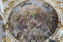 Über dem nördlichen Seitenaltar ist die Übergabe der Schenkungsurkunde des Bayernherzogs Theodo II. an den heiligen Rupert (der auf das Gnadenbild von Altötting weist) zu sehen. Am Bildrand findet sich ein Selbstporträt Solls mit seiner Ehefrau. Über dem südlichen Seitenaltar ist die Erklärung Benno von Meißens zum Patron Bayerns dargestellt, nachdem die Gebeine des Heiligen 1576 auf Anordnung von Albrecht V. nach München überführt worden waren.