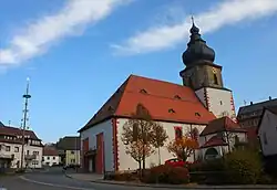 Der Chorturm der spätgotischen Hallenkirche stammt im Kern aus dem 13./14. Jahrhundert. Er wurde 1752 nach einem Entwurf von Johann Jakob Michael Küchel aufgestockt, um die Turmuhr und den Glockenstuhl für die vier Kirchenglocken unterzubringen, und mit einer schiefergedeckten Welschen Haube bedeckt. Der Chor befindet sich im Erdgeschoss des Chorturms. Dort ist in einer Mauer ein Sakramentshaus eingelassen.