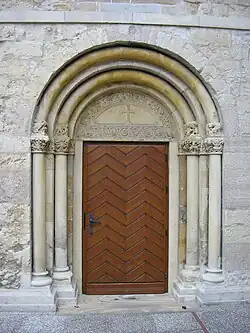 Die mit Quadermauerwerk errichtete romanische Kirche ist einschiffig dreijochig und ist mit einem Choranbau gerade geschlossen. Der Westturm wurde im 19. Jahrhundert neu errichtet. Der Kirchenraum ist von einer Holzdecke überspannt, die zwischen den spitzbögigen Blendbogen auf den Wandpfeilern lastet. Die rundbogigen Fenster sind einteilig und wurden zum Teil erweitert. Das Portal an der Südseite ist ebenfalls rundbogig und mit Ecksäulen, darauf lastet ein Tympanon. Die Kapitelle der Säulen sind mit Figurenschmuck und Blattwerk versehen. Im Tympanon ist ein Kreuz abgebildet; der Rand ist mit einem Kantenfries versehen.