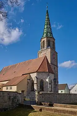 Das Langhaus der Saalkirche und der Chor mit fünfseitigem Schluss im Westen wurden im späten 14. Jahrhundert gebaut. An der Nordwand des vor 1438 errichteten Chors mit 5/8-Schluss im Osten wurde 1482 der Chorflankenturm aus drei quadratischen Geschossen angebaut, der 1680/81 mit einem achteckigen Geschoss aufgestockt und mit glasierten Dachziegeln bedeckt wurde.
