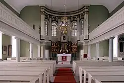 Die ungegliederte Backsteinkirche besitzt ein Satteldach und an der Ostseite einen nahezu vollständig in das Kirchenschiff integrierten Kirchturm. Das Gebäude ruht auf einem Feldsteinsockel und wird durch die klare Formensprache des Klassizismus gekennzeichnet. Die Kirche ist nicht geostet. Der Eingang befindet sich in der Ostseite, wohingegen der Altar und die Kanzel an der Westseite des Gebäudes untergebracht sind. Die Sakristei kann durch einen Eingang an der Westwand betreten werden. Große rundbogige Fenster dominieren die Längsseiten der Kirche. Der helle Innenraum wir durch die umlaufende Empore gegliedert und befindet sich seit einer Renovierung im Jahr 2008 wieder im Originalzustand. Die auf dorischen Säulen ruhende Empore wird durch eine Halbkreisnische für Kanzel und Altar unterbrochen.[2]