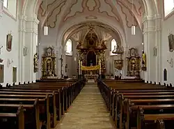 Der Innenraum des Langhauses ist mit einem Stichkappengewölbe überspannt, das auf Pilastern an den Wänden ruht. Die Deckenmalereien im Chor wurden 1915 von Josef Wittmann geschaffen. Die Kirchenausstattung stammt aus der Bauzeit. Hierzu zählt der um 1720 gebaute Hochaltar, dessen Altarretabel mit der Darstellung des heiligen Vitus von vier Säulen flankiert wird.