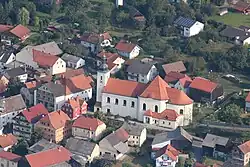 Die Saalkirche wurde 1719–21 mit einem barocken Langhaus und einem Fassadenturm im Westen erbaut. Das Langhaus wurde 1914 nach Osten um ein langgestrecktes Oktogon und einen halbrund geschlossenen Chor erweitert. Das oberste Geschoss des Fassadenturms beherbergt die Turmuhr und den Glockenstuhl. Darauf wurde 1759 eine Zwiebelhaube gesetzt, die mit einer Laterne bekrönt ist.