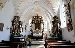 Der Innenraum ist mit einem Stichkappengewölbe überspannt. Im November 2024 zeigten sich Risse in den Putz- und Stuckstrukturen des Gewölbes. Zur Sicherung wurde für die Zeit bis zur Sanierung ein Stützgewölbe aufgestellt.[2]