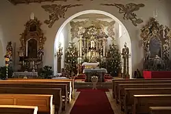 Der Innenraum des Langhauses ist mit einer Kassettendecke überspannt. Zur Kirchenausstattung gehört ein Hochaltar aus dem 18. Jahrhundert, der von sechs Säulen flankiert wird, zwischen denen die Statuen des heiligen Georg und des heiligen Florian stehen. In einer Nische steht die Statue des heiligen Vitus. Über den seitlichen Durchlässen stehen die Statuen des heiligen Paulus und des heiligen Bartholomäus. Auf der Empore steht eine Orgel der Firma Weise (1979, 15/II/P), eine Generalsanierung ist in Planung.