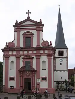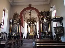 Das Langhaus wurde Ende des 17. Jahrhunderts durch eine rechteckige Saalkirche mit gotisierendem Chor und repräsentativer Fassade ersetzt. Die Portalfront zeigt Formen des römischen Barock.